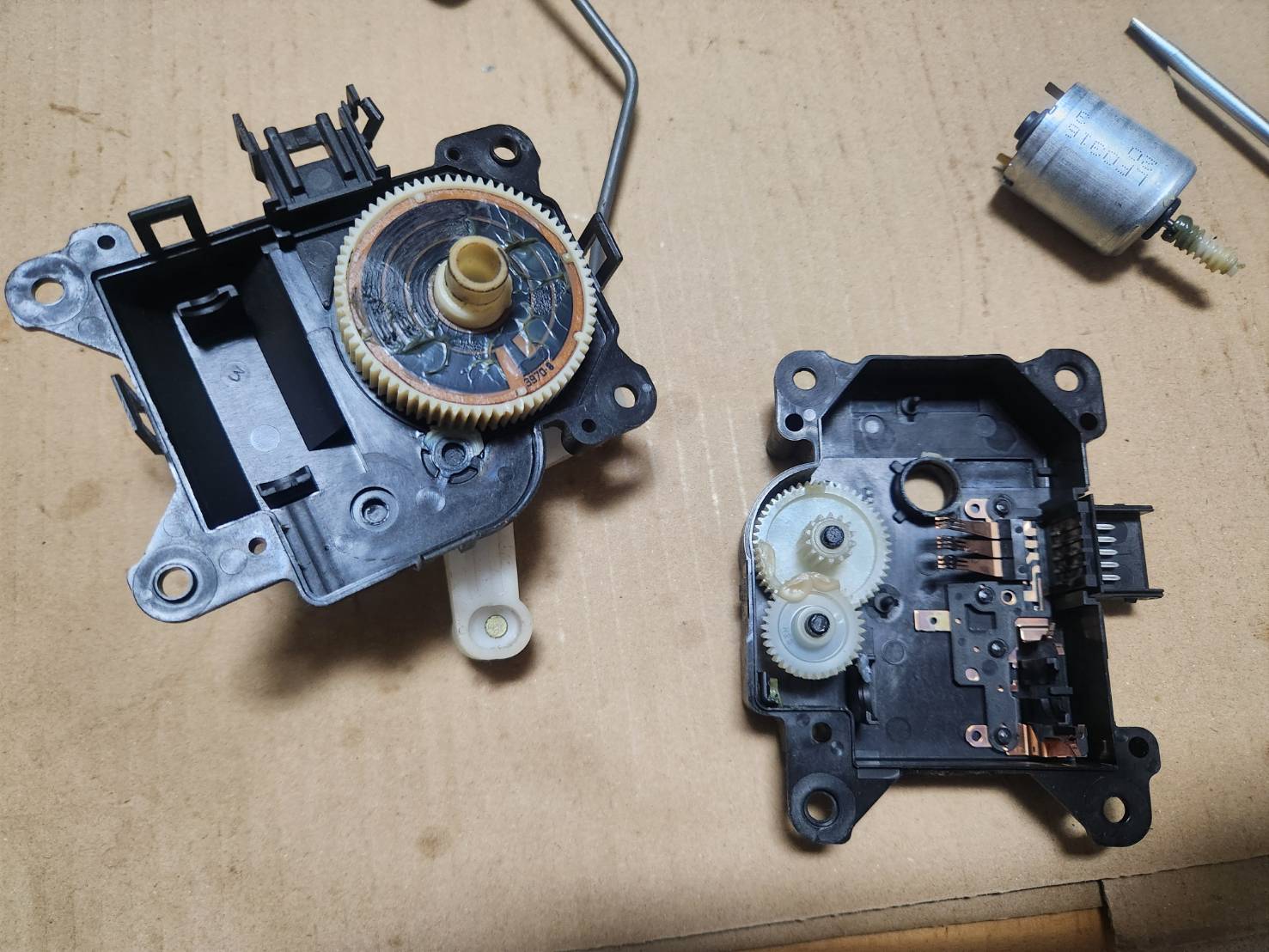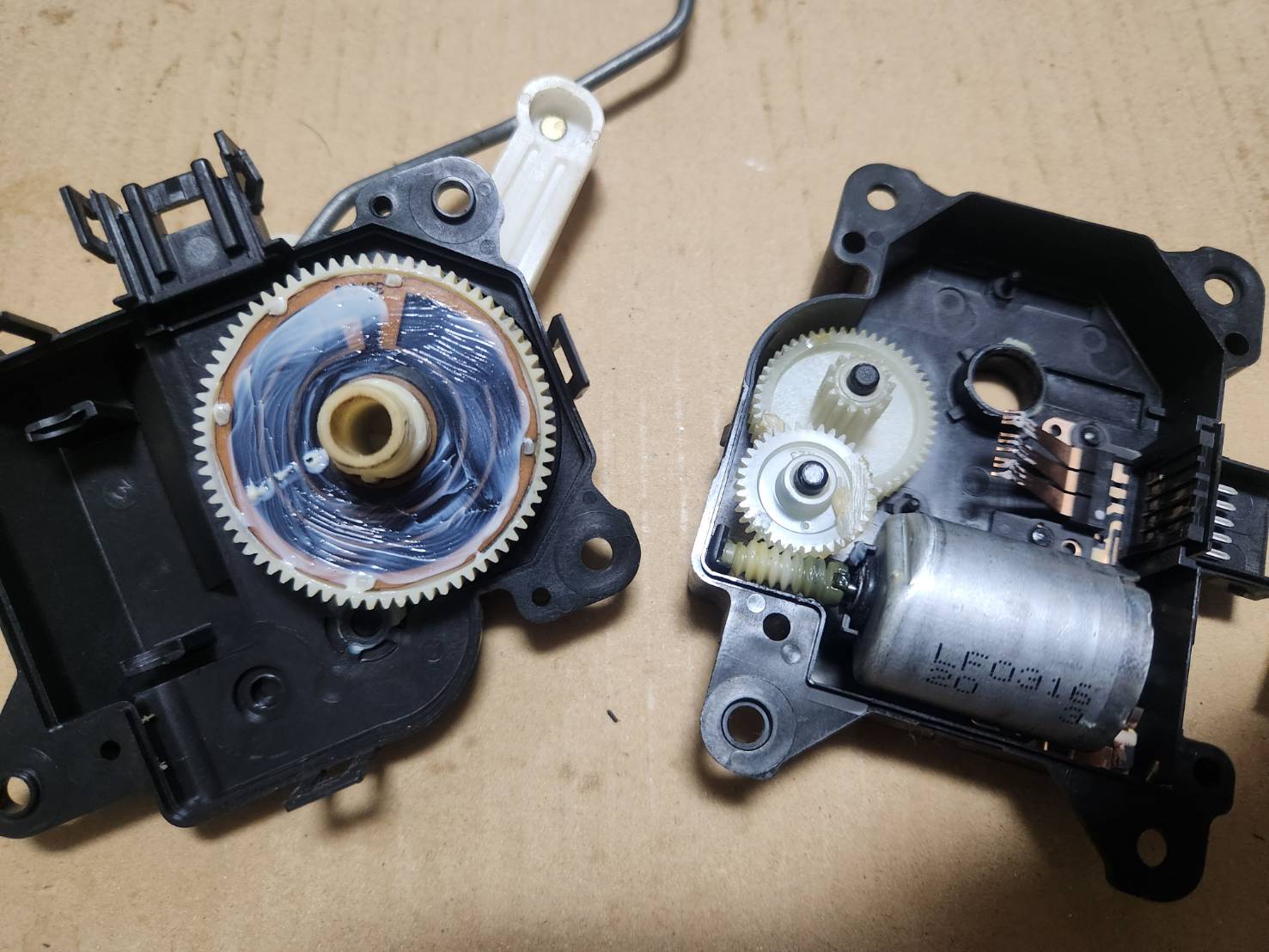 エアミックスダンパーサーボのギヤについているポジション検知の為の接点?が摩耗して導通が無くなっていることでモーターが行ったり来たりしているみたい。