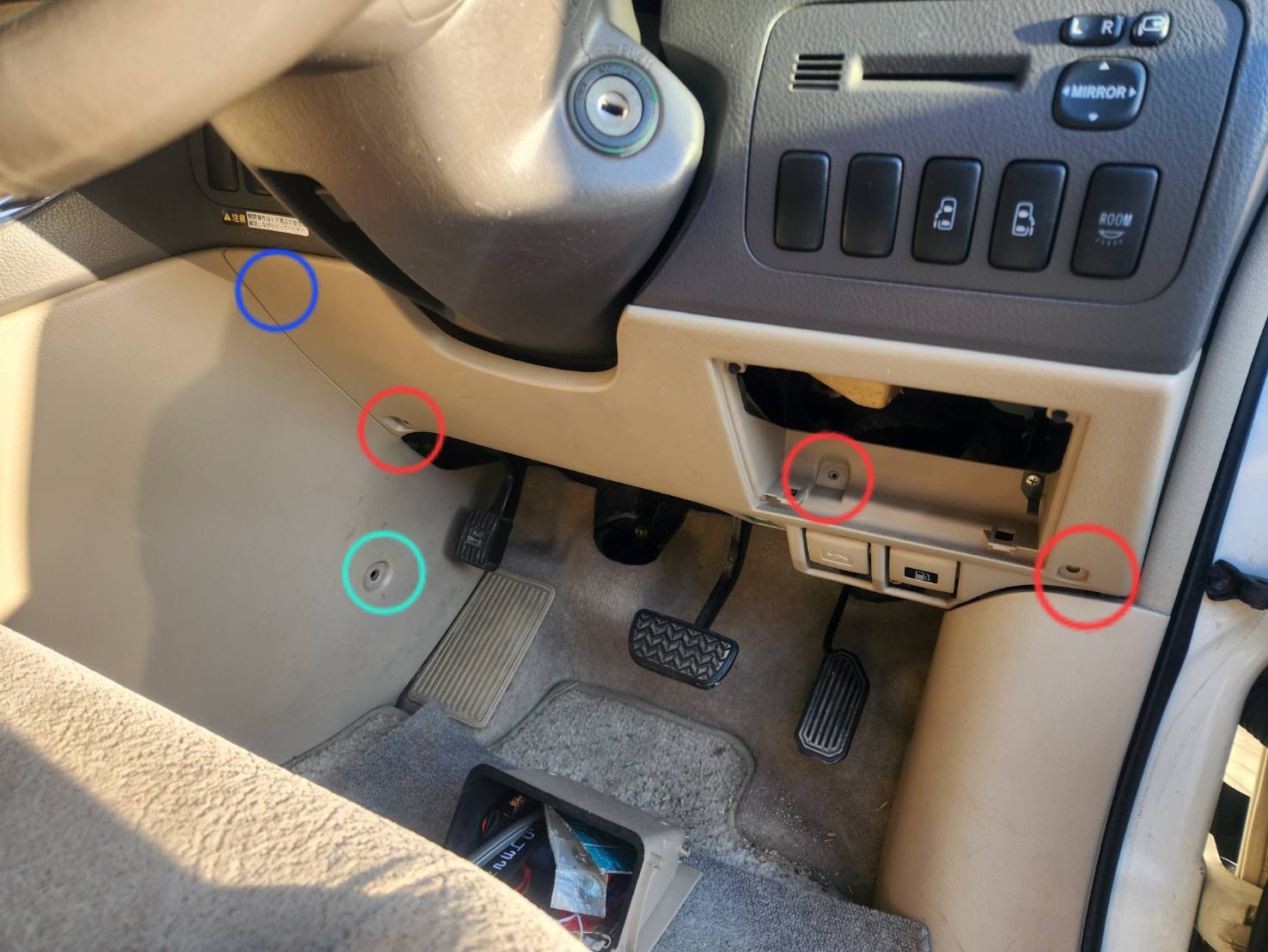 プラスネジ運転席側は赤丸部3本で正面のパネルを外し青丸部にも1本隠れています。