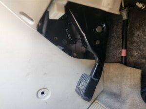 パーキングブレーキの奥に見える黒いボックスがエアミックスダンパーサーボです。