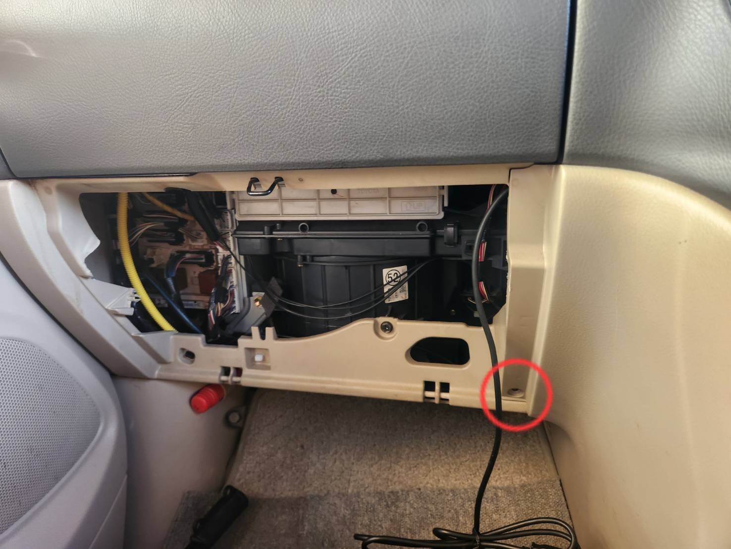プラスネジは助手席側グローブボックスを外したところにあります。