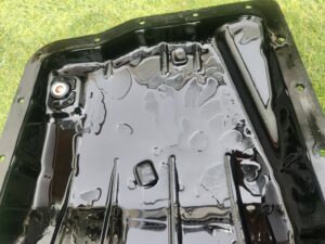 オイルパンのボルト全て緩むと後は外すだけですが、若干フレームに掛かってるので少し後ろにずらして前から引き抜く感じ。