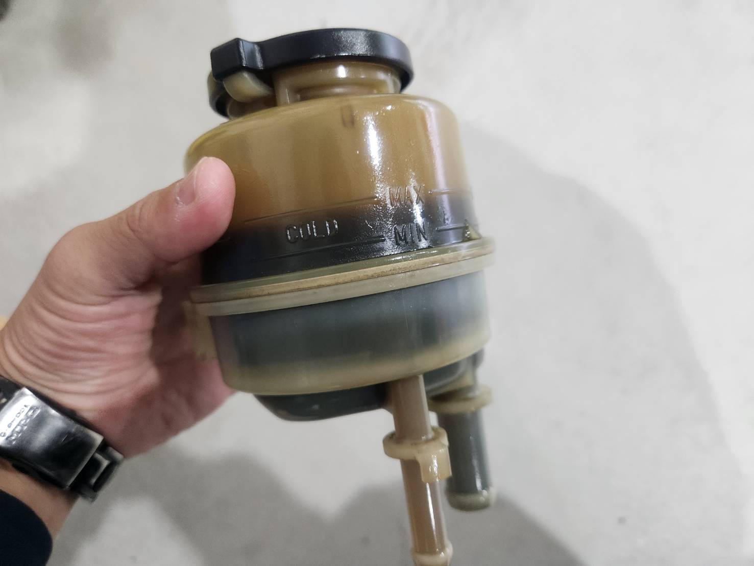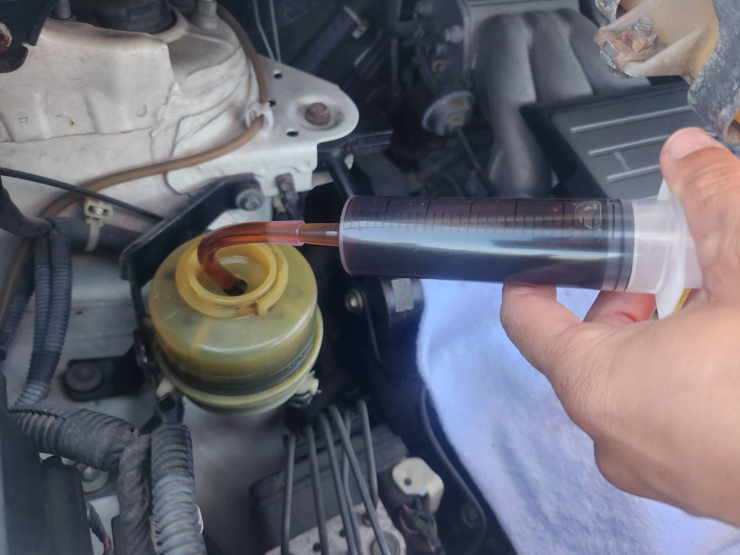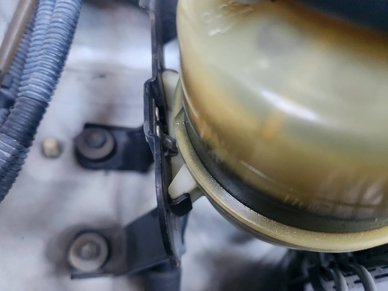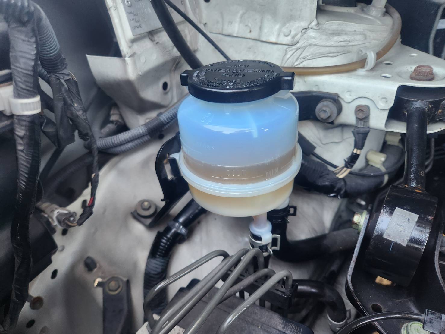 リザーバータンクのパワステフルードを抜いては新油を入れることを何回かしましたが、あまりきれいになっている実感はなし。見た感じめちゃくちゃ汚れているリザーバータンクを交換します。