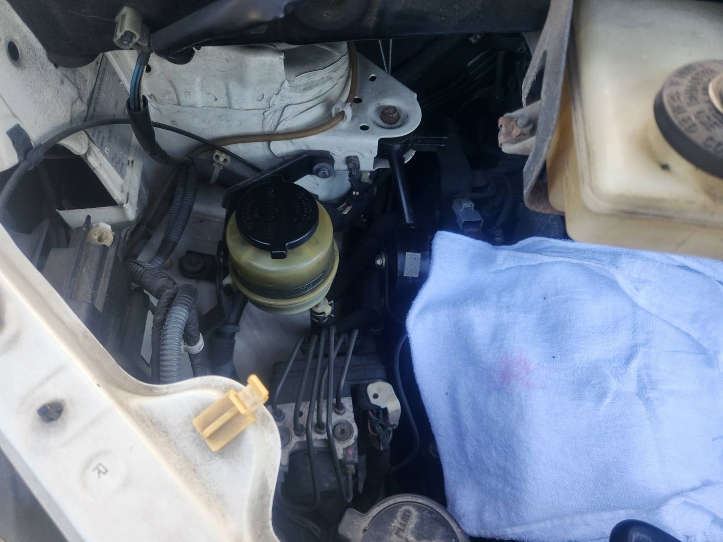 この時点で構造は分かっていませんでしたが、リザーバータンクのホースを外すとリザーバータンク下側に残っているフルードが出てくるのでウエスいっぱい置いているほうがいいです。